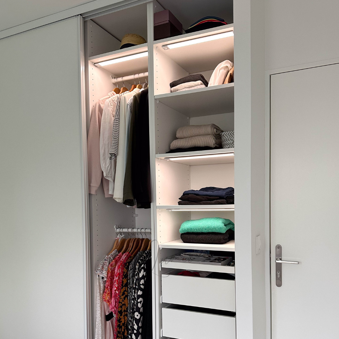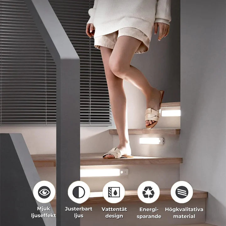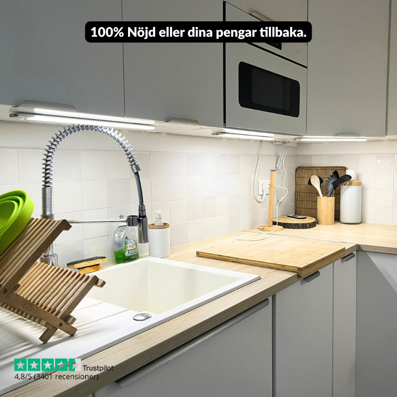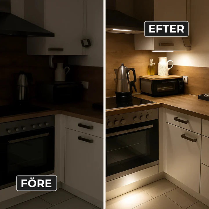 Installation tar under 30 sekunder. Dra av skyddstejpen, fäst den magnetiska remsan där du vill ha lampan och klicka fast ljuslisten. Ingen borrning, inga verktyg, ingen elektriker.